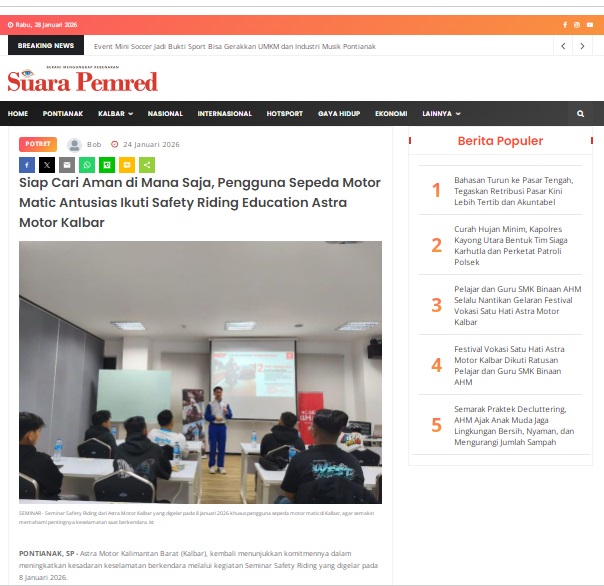 Siap Cari Aman di Mana Saja, Pengguna Sepeda Motor Matic Antusias Ikuti Safety Riding Education Astra Motor Kalbar by masmul 24 Januari 2026 in Silahkan kunjungi https://www.suarapemredkalbar.com/read/potret/24012026/siap-cari-aman-di-mana-saja-pengguna-sepeda-motor-matic-antusias-ikuti-safety-riding-education-astra-motor-kalbar. You Might Like Regional Public Launching New ADV160 The SUV Pride Grand Launching New PCX 160 Truly Exceptional! Tetap hati-hati ya bro sist berkendara saat hujan.