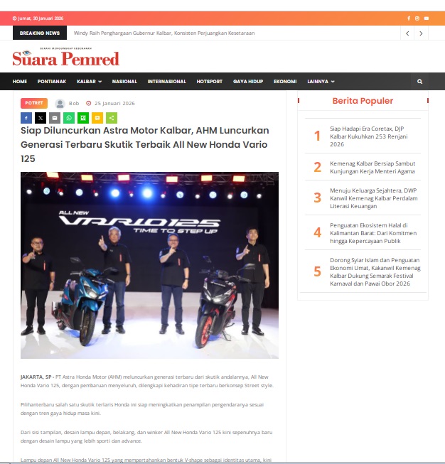Siap Diluncurkan Astra Motor Kalbar, AHM Luncurkan Generasi Terbaru Skutik Terbaik All New Honda Vario 125 by masmul 25 Januari 2026 in Silahkan kunjungi https://www.suarapemredkalbar.com/read/potret/25012026/siap-diluncurkan-astra-motor-kalbar-ahm-luncurkan-generasi-terbaru-skutik-terbaik-all-new-honda-vario-125. You Might Like Regional Public Launching New ADV160 The SUV Pride Grand Launching New PCX 160 Truly Exceptional! Tetap hati-hati ya bro sist berkendara saat hujan.