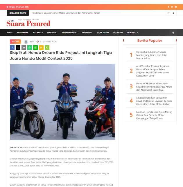 Siap Ikuti Honda Dream Ride Project, Ini Langkah Tiga Juara Honda Modif Contest 2025 by masmul 1 Januari 2026 in Silahkan kunjungi https://www.suarapemredkalbar.com/read/potret/01012026/siap-ikuti-honda-dream-ride-project-ini-langkah-tiga-juara-honda-modif-contest-2025. You Might Like Regional Public Launching New ADV160 The SUV Pride Grand Launching New PCX 160 Truly Exceptional! Tetap hati-hati ya bro sist berkendara saat hujan.