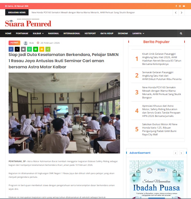 Siap jadi Duta Keselamatan Berkendara, Pelajar SMKN 1 Rasau Jaya Antusias Ikuti Seminar Cari aman bersama Astra Motor Kalbar by masmul 20 Februari 2026 in Silahkan kunjungi https://www.suarapemredkalbar.com/read/potret/20022026/siap-jadi-duta-keselamatan-berkendara-pelajar-smkn-1-rasau-jaya-antusias-ikuti-seminar-cari-aman-bersama-astra-motor-kalbar. You Might Like Regional Public Launching New ADV160 The SUV Pride Grand Launching New PCX 160 Truly Exceptional! Tetap hati-hati ya bro sist berkendara saat hujan.