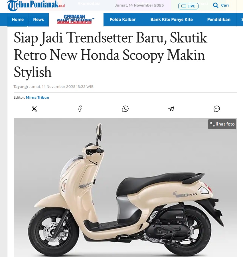 Siap Jadi Trendsetter Baru, Skutik Retro New Honda Scoopy Makin Stylish by Ishak Ismail 14 November 2025 in Silahkan kunjungi https://pontianak.tribunnews.com/otomotif/1150047/siap-jadi-trendsetter-baru-skutik-retro-new-honda-scoopy-makin-stylish. You Might Like Regional Public Launching New ADV160 The SUV Pride Grand Launching New PCX 160 Truly Exceptional! Tetap hati-hati ya bro sist berkendara saat hujan.