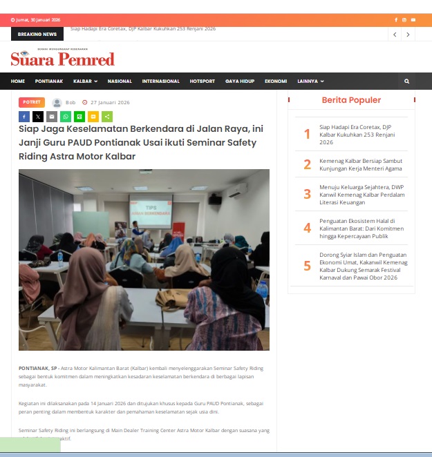 Siap Jaga Keselamatan Berkendara di Jalan Raya, ini Janji Guru PAUD Pontianak Usai ikuti Seminar Safety Riding Astra Motor Kalbar by masmul 26 Januari 2026 in Silahkan kunjungi https://www.suarapemredkalbar.com/read/potret/27012026/siap-jaga-keselamatan-berkendara-di-jalan-raya-ini-janji-guru-paud-pontianak-usai-ikuti-seminar-safety-riding-astra-motor-kalbar. You Might Like Regional Public Launching New ADV160 The SUV Pride Grand Launching New PCX 160 Truly Exceptional! Tetap hati-hati ya bro sist berkendara saat hujan.