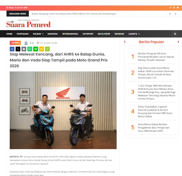 Siap Melesat Kencang, dari AHRS ke Balap Dunia, Mario dan Veda Siap Tampil pada Moto Grand Prix 2026 by masmul 21 Januari 2026 in Silahkan kunjungi https://www.suarapemredkalbar.com/read/potret/21012026/siap-melesat-kencang-dari-ahrs-ke-balap-dunia-mario-dan-veda-siap-tampil-pada-moto-grand-prix-2026. You Might Like Regional Public Launching New ADV160 The SUV Pride Grand Launching New PCX 160 Truly Exceptional! Tetap hati-hati ya bro sist berkendara saat hujan.