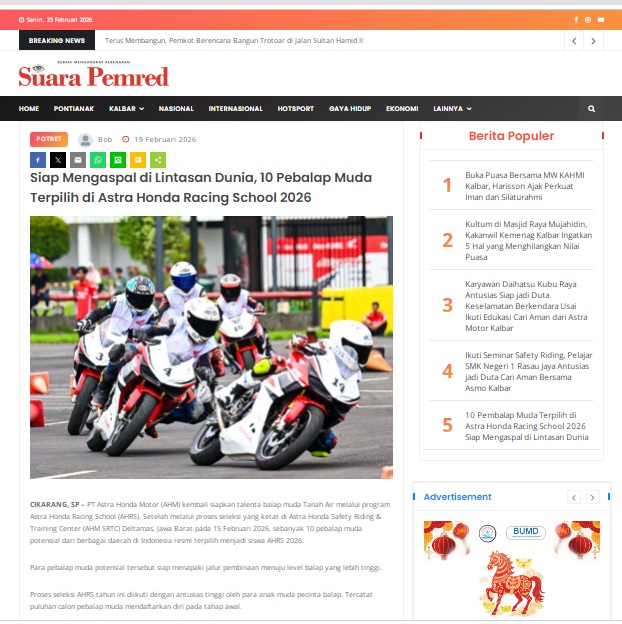 Siap Mengaspal di Lintasan Dunia, 10 Pebalap Muda Terpilih di Astra Honda Racing School 2026 by masmul 19 Februari 2026 in Silahkan kunjungi https://www.suarapemredkalbar.com/read/potret/19022026/siap-mengaspal-di-lintasan-dunia-10-pebalap-muda-terpilih-di-astra-honda-racing-school-2026. You Might Like Regional Public Launching New ADV160 The SUV Pride Grand Launching New PCX 160 Truly Exceptional! Tetap hati-hati ya bro sist berkendara saat hujan.