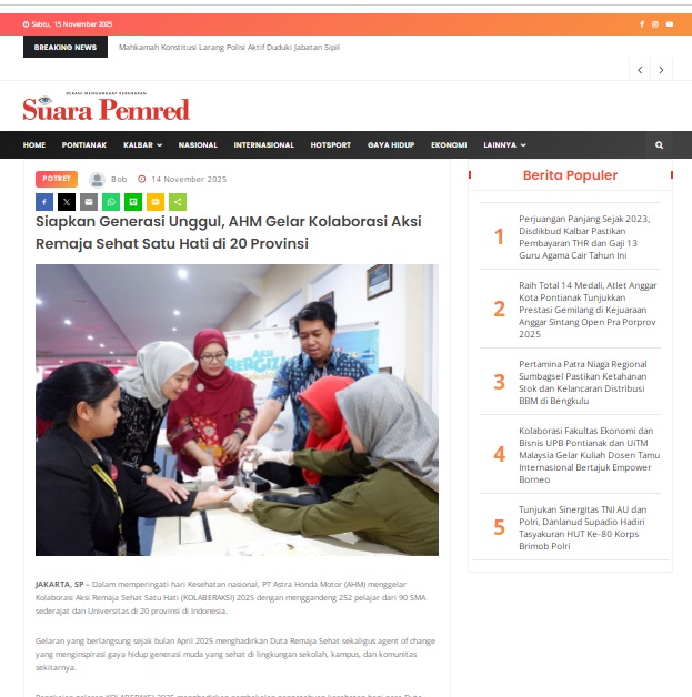 Siapkan Generasi Unggul, AHM Gelar Kolaborasi Aksi Remaja Sehat Satu Hati di 20 Provinsi by masmul 14 November 2025 in Silahkan kunjungi https://www.suarapemredkalbar.com/read/potret/14112025/siapkan-generasi-unggul-ahm-gelar-kolaborasi-aksi-remaja-sehat-satu-hati-di-20-provinsi. You Might Like Regional Public Launching New ADV160 The SUV Pride Grand Launching New PCX 160 Truly Exceptional! Tetap hati-hati ya bro sist berkendara saat hujan.