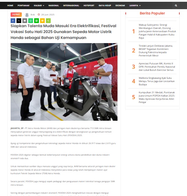 Siapkan Talenta Muda Masuki Era Elektrifikasi, Festival Vokasi Satu Hati 2025 Gunakan Sepeda Motor Listrik Honda sebagai Bahan Uji Kemampuan by masmul 28 Juni 2025 in Silahkan kunjungi https://www.suarapemredkalbar.com/read/potret/28062025/siapkan-talenta-muda-masuki-era-elektrifikasi-festival-vokasi-satu-hati-2025-gunakan-sepeda-motor-listrik-honda-sebagai-bahan-uji-kemampuan. You Might Like Regional Public Launching New ADV160 The SUV Pride Grand Launching New PCX 160 Truly Exceptional! Tetap hati-hati ya bro sist berkendara saat hujan.
