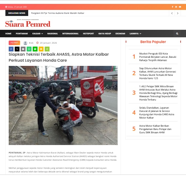 Siapkan Teknisi Terbaik AHASS, Astra Motor Kalbar Perkuat Layanan Honda Care by masmul 20 Januari 2026 in Silahkan kunjungi https://www.suarapemredkalbar.com/read/potret/20012026/siapkan-teknisi-terbaik-ahass-astra-motor-kalbar-perkuat-layanan-honda-care. You Might Like Regional Public Launching New ADV160 The SUV Pride Grand Launching New PCX 160 Truly Exceptional! Tetap hati-hati ya bro sist berkendara saat hujan.