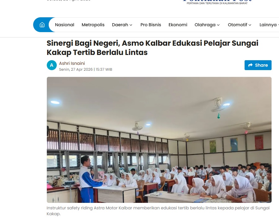 Sinergi Bagi Negeri, Asmo Kalbar Edukasi Pelajar Sungai Kakap Tertib Berlalu Lintas by Aristono Edi Kiswantoro 27 April 2026 in Silahkan kunjungi https://pontianakpost.jawapos.com/otomotif/2604270055/sinergi-bagi-negeri-asmo-kalbar-edukasi-pelajar-sungai-kakap-tertib-berlalu-lintas. You Might Like Regional Public Launching New ADV160 The SUV Pride Grand Launching New PCX 160 Truly Exceptional! Tetap hati-hati ya bro sist berkendara saat hujan.