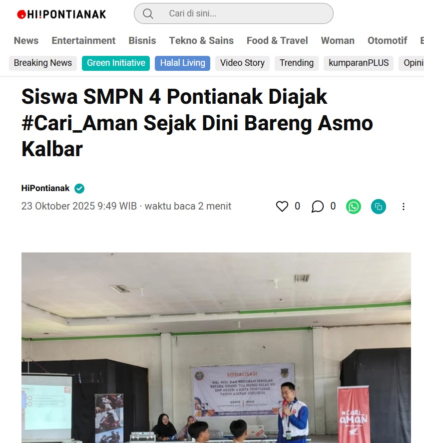 Siswa SMPN 4 Pontianak Diajak #Cari_Aman Sejak Dini Bareng Asmo Kalbar by Leo Prima 23 Oktober 2025 in Silahkan kunjungi https://kumparan.com/hipontianak/2664AVUIBlS?utm_source=App&utm_medium=wa&shareID=LYeovrGEeeRZ. You Might Like Regional Public Launching New ADV160 The SUV Pride Grand Launching New PCX 160 Truly Exceptional! Tetap hati-hati ya bro sist berkendara saat hujan.