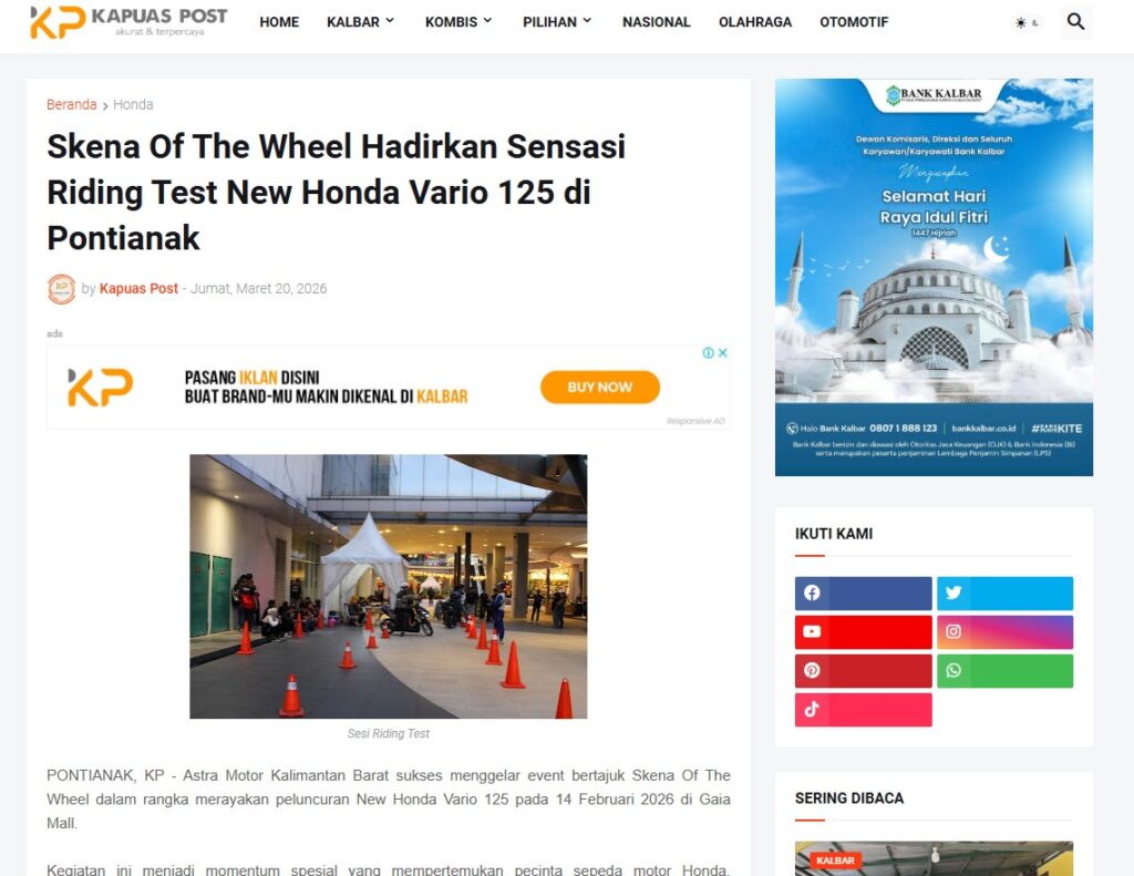 Skena Of The Wheel Hadirkan Sensasi Riding Test New Honda Vario 125 di Pontianak by Muhammad Arif 20 Maret 2026 in Silahkan kunjungi https://www.kapuaspost.web.id/2026/03/skena-of-wheel-hadirkan-sensasi-riding.html. Tags: astra Astra Motor kalbar Astra Motor Pontianak astramotor honda kalbar pontianak sepeda motor You Might Like Regional Public Launching New ADV160 The SUV Pride Grand Launching New PCX 160 Truly Exceptional! Tetap hati-hati ya bro sist berkendara saat hujan.