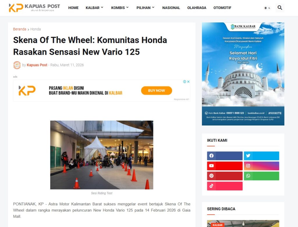Skena Of The Wheel: Komunitas Honda Rasakan Sensasi New Vario 125 by Muhammad Arif 11 Maret 2026 in Silahkan kunjungi https://www.kapuaspost.web.id/2026/03/skena-of-wheel-komunitas-honda-rasakan.html. Tags: astra Astra Motor kalbar Astra Motor Pontianak astramotor honda kalbar pontianak sepeda motor You Might Like Regional Public Launching New ADV160 The SUV Pride Grand Launching New PCX 160 Truly Exceptional! Tetap hati-hati ya bro sist berkendara saat hujan.