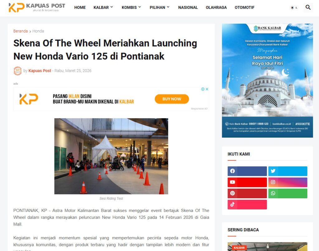 Skena Of The Wheel Meriahkan Launching New Honda Vario 125 di Pontianak by Muhammad Arif 25 Maret 2026 in Silahkan kunjungi https://www.kapuaspost.web.id/2026/03/skena-of-wheel-meriahkan-launching-new.html. Tags: astra Astra Motor kalbar Astra Motor Pontianak astramotor honda kalbar pontianak sepeda motor You Might Like Regional Public Launching New ADV160 The SUV Pride Grand Launching New PCX 160 Truly Exceptional! Tetap hati-hati ya bro sist berkendara saat hujan.
