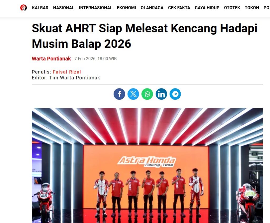 Skuat AHRT Siap Melesat Kencang Hadapi Balapan Musim 2026 by Faisal Rizal 7 Februari 2026 in Silahkan kunjungi https://wartapontianak.pikiran-rakyat.com/olahraga/pr-1179990381/skuat-ahrt-siap-melesat-kencang-hadapi-musim-balap-2026. You Might Like Regional Public Launching New ADV160 The SUV Pride Grand Launching New PCX 160 Truly Exceptional! Tetap hati-hati ya bro sist berkendara saat hujan.