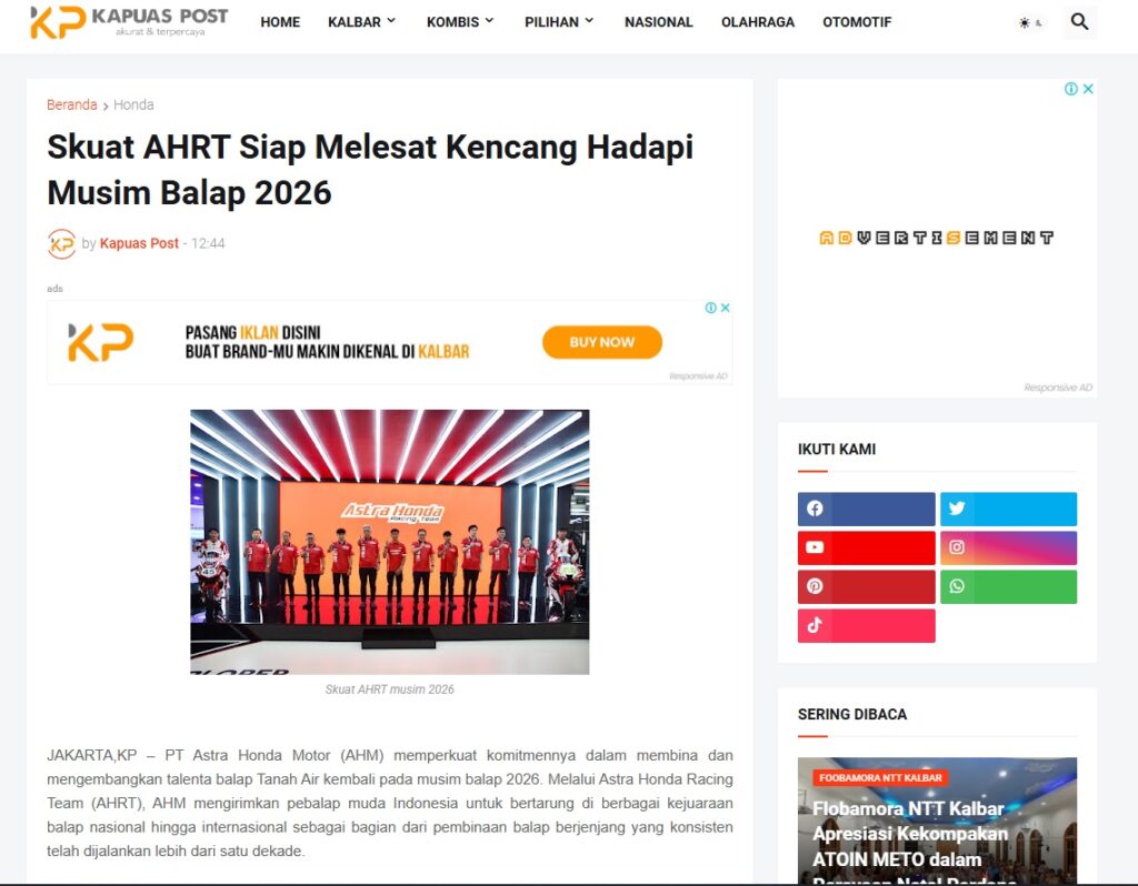 Skuat AHRT Siap Melesat Kencang Hadapi Musim Balap 2026 by Muhammad Arif 6 Februari 2026 in Silahkan kunjungi https://www.kapuaspost.web.id/2026/02/skuat-ahrt-siap-melesat-kencang-hadapi.html. Tags: astra Astra Motor kalbar Astra Motor Pontianak astramotor honda kalbar pontianak sepeda motor You Might Like Regional Public Launching New ADV160 The SUV Pride Grand Launching New PCX 160 Truly Exceptional! Tetap hati-hati ya bro sist berkendara saat hujan.