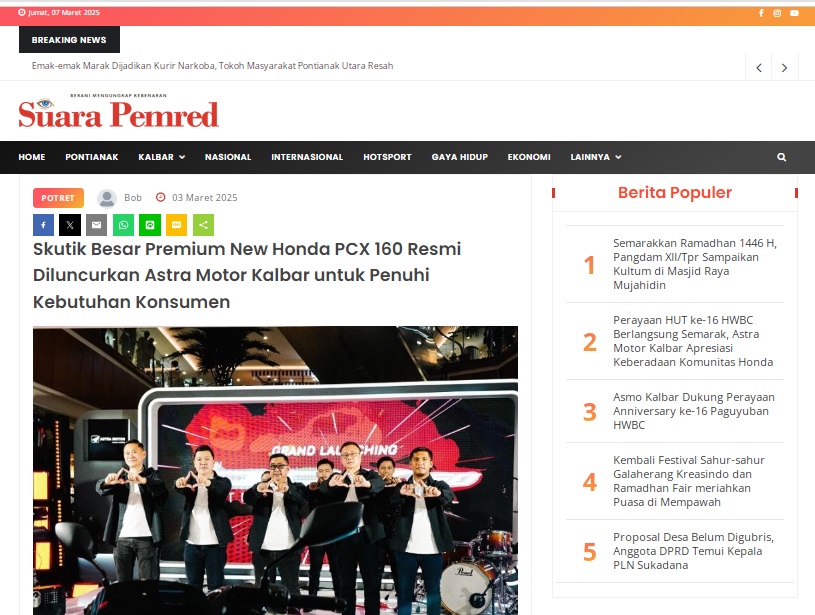 Skutik Besar Premium New Honda PCX 160 Resmi Diluncurkan Astra Motor Kalbar untuk Penuhi Kebutuhan Konsumen by masmul 3 Maret 2025 in Silahkan kunjungi https://www.suarapemredkalbar.com/read/potret/03032025/skutik-besar-premium-new-honda-pcx-160-resmi-diluncurkan-astra-motor-kalbar-untuk-penuhi-kebutuhan-konsumen. You Might Like Regional Public Launching New ADV160 The SUV Pride Grand Launching New PCX 160 Truly Exceptional! Tetap hati-hati ya bro sist berkendara saat hujan.