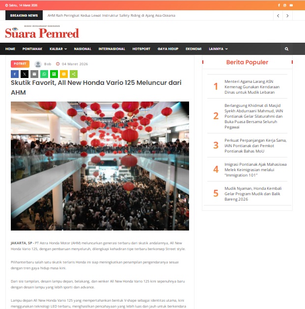 Skutik Favorit, All New Honda Vario 125 Meluncur dari AHM by masmul 4 Maret 2026 in Silahkan kunjungi https://www.suarapemredkalbar.com/read/potret/04032026/skutik-favorit-all-new-honda-vario-125-meluncur-dari-ahm. You Might Like Regional Public Launching New ADV160 The SUV Pride Grand Launching New PCX 160 Truly Exceptional! Tetap hati-hati ya bro sist berkendara saat hujan.