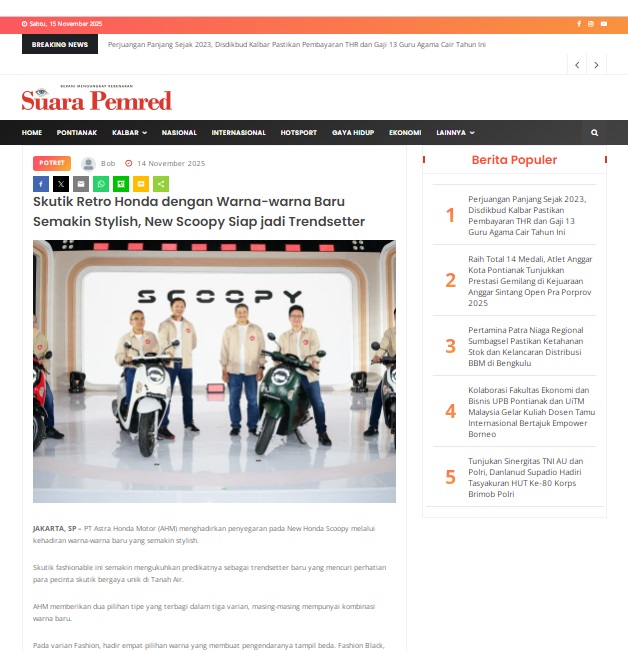 Skutik Retro Honda dengan Warna-warna Baru Semakin Stylish, New Scoopy Siap jadi Trendsetter by masmul 14 November 2025 in Silahkan kunjungi https://www.suarapemredkalbar.com/read/potret/14112025/skutik-retro-honda-dengan-warna-warna-baru-semakin-stylish-new-scoopy-siap-jadi-trendsetter. You Might Like Regional Public Launching New ADV160 The SUV Pride Grand Launching New PCX 160 Truly Exceptional! Tetap hati-hati ya bro sist berkendara saat hujan.