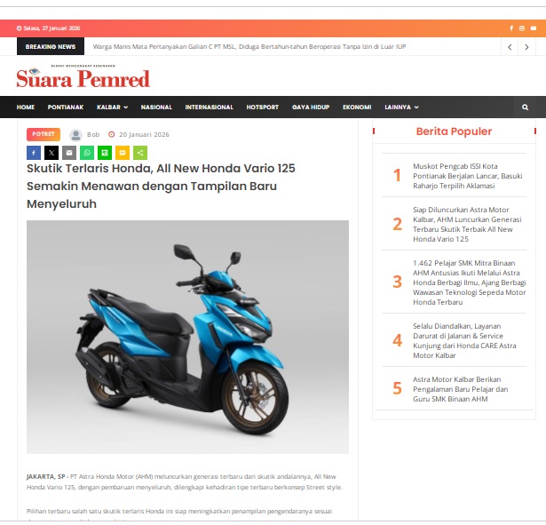 Skutik Terlaris Honda, All New Honda Vario 125 Semakin Menawan dengan Tampilan Baru Menyeluruh by masmul 20 Januari 2026 in Silahkan kunjungi https://www.suarapemredkalbar.com/read/potret/20012026/skutik-terlaris-honda-all-new-honda-vario-125-semakin-menawan-dengan-tampilan-baru-menyeluruh. You Might Like Regional Public Launching New ADV160 The SUV Pride Grand Launching New PCX 160 Truly Exceptional! Tetap hati-hati ya bro sist berkendara saat hujan.