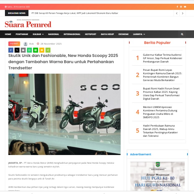 Skutik Unik dan Fashionable, New Honda Scoopy 2025 dengan Tambahan Warna Baru untuk Pertahankan Trendsetter by masmul 28 November 2025 in Silahkan kunjungi https://www.suarapemredkalbar.com/read/potret/28112025/skutik-unik-dan-fashionable-new-honda-scoopy-2025-dengan-tambahan-warna-baru-untuk-pertahankan-trendsetter. You Might Like Regional Public Launching New ADV160 The SUV Pride Grand Launching New PCX 160 Truly Exceptional! Tetap hati-hati ya bro sist berkendara saat hujan.