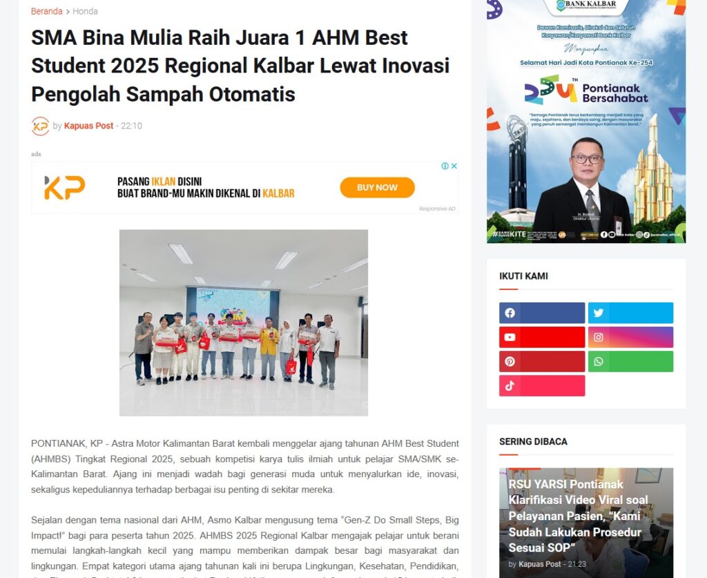 SMA Bina Mulia Raih Juara 1 AHM Best Student 2025 Regional Kalbar Lewat Inovasi Pengolah Sampah Otomatis by Muhammad Arif 22 Oktober 2025 in Silahkan kunjungi https://www.kapuaspost.web.id/2025/10/sma-bina-mulia-raih-juara-1-ahm-best_27.html. Tags: astra Astra Motor kalbar Astra Motor Pontianak astramotor honda kalbar pontianak sepeda motor You Might Like Regional Public Launching New ADV160 The SUV Pride Grand Launching New PCX 160 Truly Exceptional! Tetap hati-hati ya bro sist berkendara saat hujan.