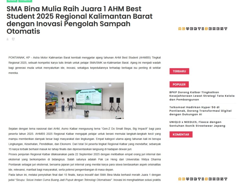 SMA Bina Mulia Raih Juara 1 AHM Best Student 2025 Regional Kalimantan Barat dengan Inovasi Pengolah Sampah Otomatis by Muhammad Arif 4 Oktober 2025 in Silahkan kunjungi https://www.kapuaspost.web.id/2025/10/sma-bina-mulia-raih-juara-1-ahm-best.html. Tags: astra Astra Motor kalbar Astra Motor Pontianak astramotor honda kalbar pontianak sepeda motor You Might Like Regional Public Launching New ADV160 The SUV Pride Grand Launching New PCX 160 Truly Exceptional! Tetap hati-hati ya bro sist berkendara saat hujan.