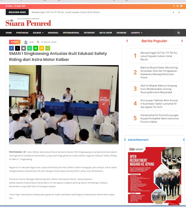 SMAN 1 Singkawang Antusias Ikuti Edukasi Safety Riding dari Astra Motor Kalbar by masmul 19 Maret 2025 in Silahkan kunjungi https://www.suarapemredkalbar.com/read/potret/19032025/sman-1-singkawang-antusias-ikuti-edukasi-safety-riding-dari-astra-motor-kalbar. You Might Like Regional Public Launching New ADV160 The SUV Pride Grand Launching New PCX 160 Truly Exceptional! Tetap hati-hati ya bro sist berkendara saat hujan.