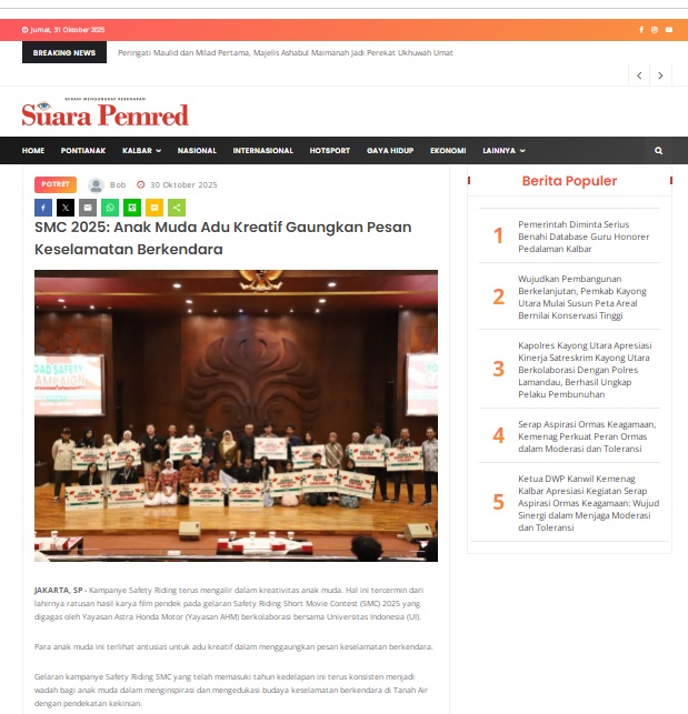SMC 2025: Anak Muda Adu Kreatif Gaungkan Pesan Keselamatan Berkendara by masmul 30 Oktober 2025 in Silahkan kunjungi https://www.suarapemredkalbar.com/read/potret/30102025/smc-2025-anak-muda-adu-kreatif-gaungkan-pesan-keselamatan-berkendara. You Might Like Regional Public Launching New ADV160 The SUV Pride Grand Launching New PCX 160 Truly Exceptional! Tetap hati-hati ya bro sist berkendara saat hujan.