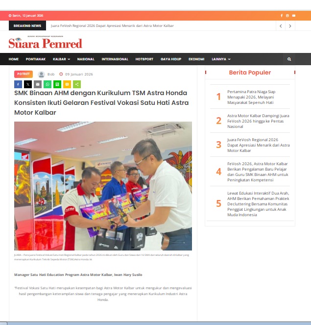 SMK Binaan AHM dengan Kurikulum TSM Astra Honda Konsisten Ikuti Gelaran Festival Vokasi Satu Hati Astra Motor Kalbar by masmul 9 Januari 2026 in Silahkan kunjungi https://www.suarapemredkalbar.com/read/potret/09012026/smk-binaan-ahm-dengan-kurikulum-tsm-astra-honda-konsisten-ikuti-gelaran-festival-vokasi-satu-hati-astra-motor-kalbar. You Might Like Regional Public Launching New ADV160 The SUV Pride Grand Launching New PCX 160 Truly Exceptional! Tetap hati-hati ya bro sist berkendara saat hujan.