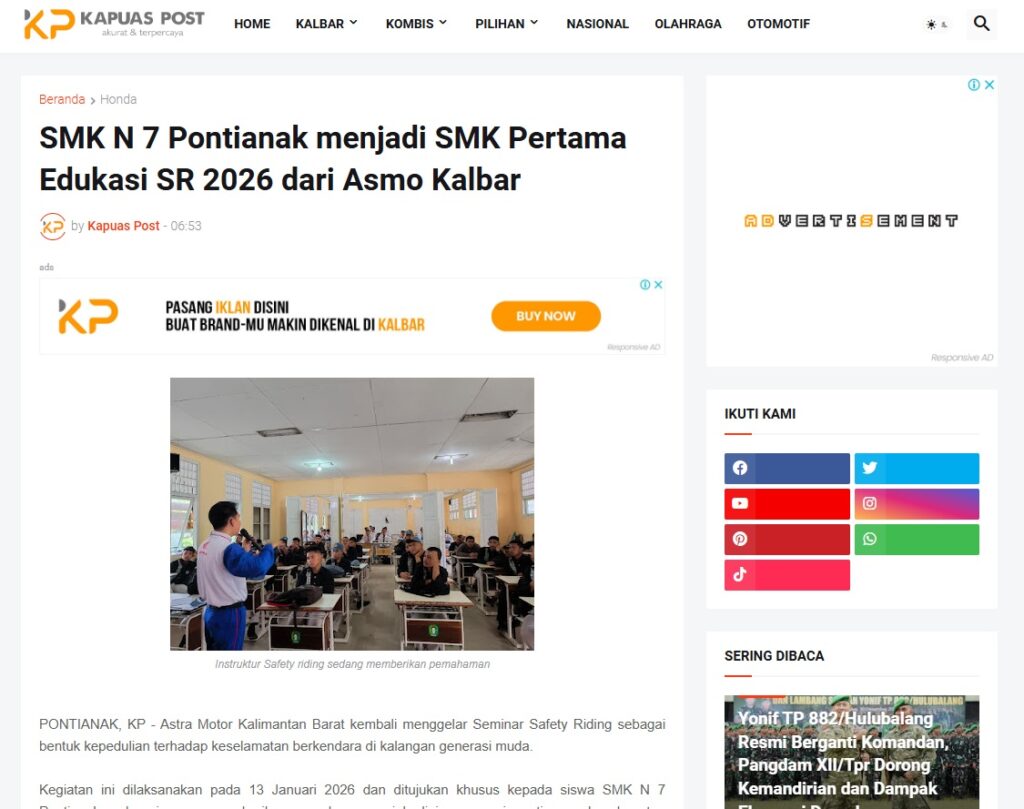 SMK N 7 Pontianak menjadi SMK Pertama Edukasi SR 2026 dari Asmo Kalbar by Muhammad Arif 22 Januari 2026 in Silahkan kunjungi https://www.kapuaspost.web.id/2026/01/smk-n-7-pontianak-menjadi-smk-pertama.html. Tags: astra Astra Motor kalbar Astra Motor Pontianak astramotor honda kalbar pontianak sepeda motor You Might Like Regional Public Launching New ADV160 The SUV Pride Grand Launching New PCX 160 Truly Exceptional! Tetap hati-hati ya bro sist berkendara saat hujan.