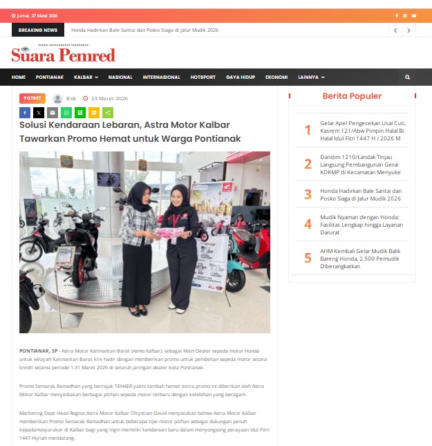 Solusi Kendaraan Lebaran, Astra Motor Kalbar Tawarkan Promo Hemat untuk Warga Pontianak by masmul 23 Maret 2026 in Silahkan kunjungi https://www.suarapemredkalbar.com/read/potret/23032026/solusi-kendaraan-lebaran-astra-motor-kalbar-tawarkan-promo-hemat-untuk-warga-pontianak. You Might Like Regional Public Launching New ADV160 The SUV Pride Grand Launching New PCX 160 Truly Exceptional! Tetap hati-hati ya bro sist berkendara saat hujan.