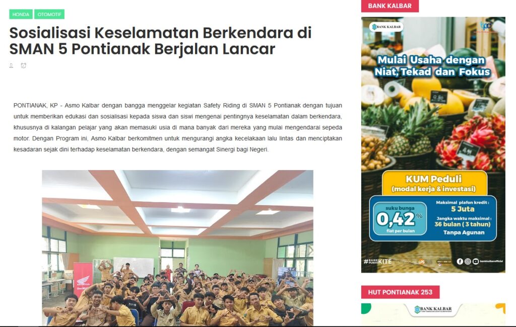 Sosialisasi Keselamatan Berkendara di SMAN 5 Pontianak Berjalan Lancar by Muhammad Arif 11 Desember 2024 in Silahkan kunjungi https://www.kapuaspost.web.id/2024/12/sosialisasi-keselamatan-berkendara-di.html. Tags: astra Astra Motor kalbar Astra Motor Pontianak astramotor honda kalbar pontianak sepeda motor You Might Like Regional Public Launching New ADV160 The SUV Pride Grand Launching New PCX 160 Truly Exceptional! Tetap hati-hati ya bro sist berkendara saat hujan.