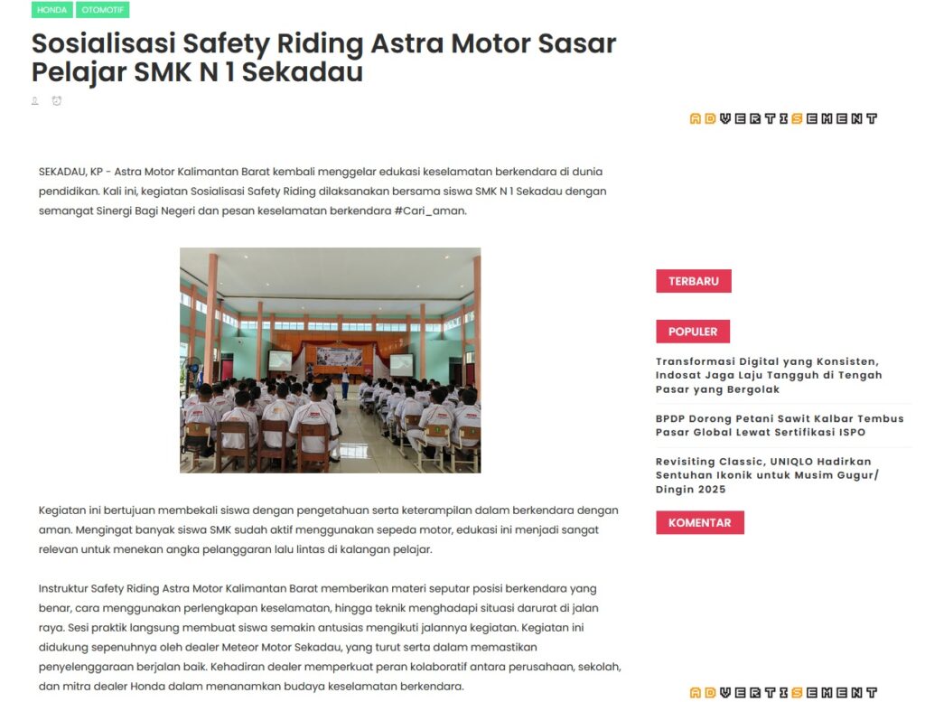 Sosialisasi Safety Riding Astra Motor Sasar Pelajar SMK N 1 Sekadau by Muhammad Arif 22 Agustus 2025 in Silahkan kunjungi https://www.kapuaspost.web.id/2025/08/sosialisasi-safety-riding-astra-motor.html. Tags: astra Astra Motor kalbar Astra Motor Pontianak astramotor honda kalbar pontianak sepeda motor You Might Like Regional Public Launching New ADV160 The SUV Pride Grand Launching New PCX 160 Truly Exceptional! Tetap hati-hati ya bro sist berkendara saat hujan.