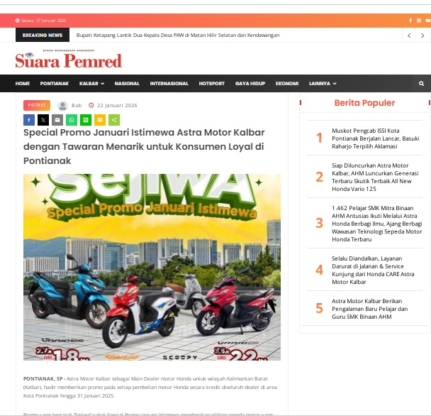 Special Promo Januari Istimewa Astra Motor Kalbar dengan Tawaran Menarik untuk Konsumen Loyal di Pontianak by masmul 22 Januari 2026 in Silahkan kunjungi https://www.suarapemredkalbar.com/read/potret/22012026/special-promo-januari-istimewa-astra-motor-kalbar-dengan-tawaran-menarik-untuk-konsumen-loyal-di-pontianak. You Might Like Regional Public Launching New ADV160 The SUV Pride Grand Launching New PCX 160 Truly Exceptional! Tetap hati-hati ya bro sist berkendara saat hujan.