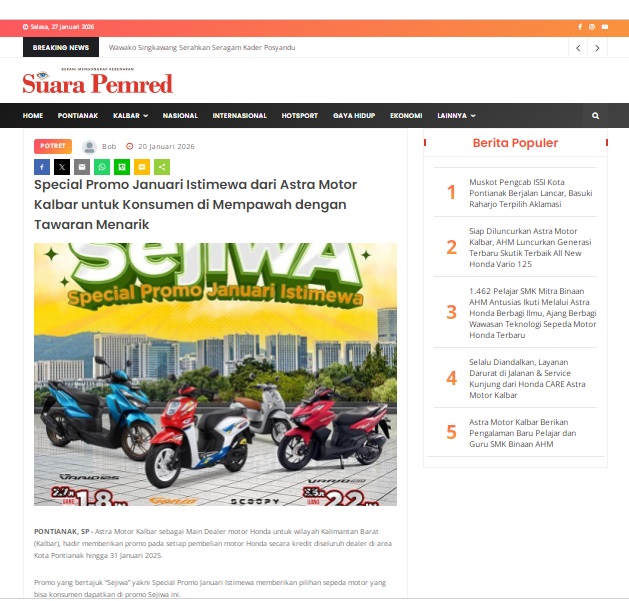 Special Promo Januari Istimewa dari Astra Motor Kalbar untuk Konsumen di Mempawah dengan Tawaran Menarik by masmul 20 Januari 2026 in Silahkan kunjungi https://www.suarapemredkalbar.com/read/potret/20012026/special-promo-januari-istimewa-dari-astra-motor-kalbar-untuk-konsumen-di-mempawah-dengan-tawaran-menarik. You Might Like Regional Public Launching New ADV160 The SUV Pride Grand Launching New PCX 160 Truly Exceptional! Tetap hati-hati ya bro sist berkendara saat hujan.