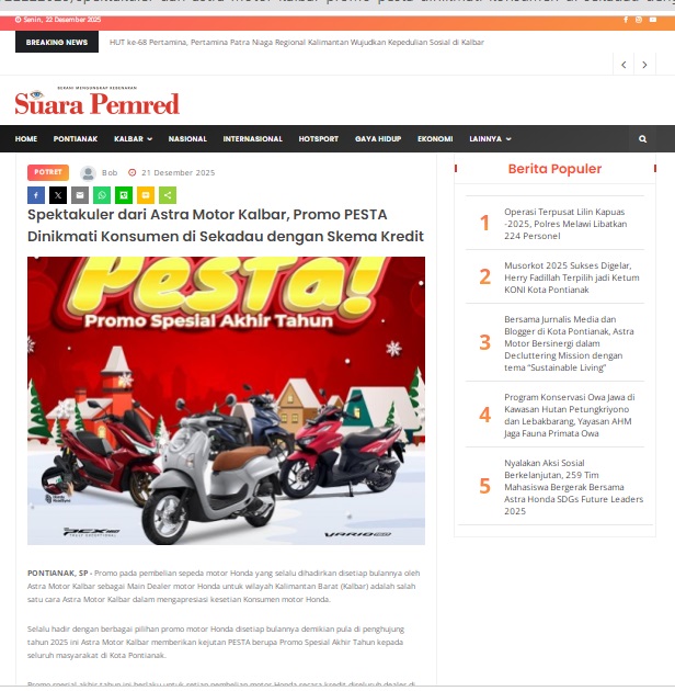 Spektakuler dari Astra Motor Kalbar, Promo PESTA Dinikmati Konsumen di Sekadau dengan Skema Kredit by masmul 21 Desember 2025 in Silahkan kunjungi https://www.suarapemredkalbar.com/read/potret/21122025/spektakuler-dari-astra-motor-kalbar-promo-pesta-dinikmati-konsumen-di-sekadau-dengan-skema-kredit. You Might Like Regional Public Launching New ADV160 The SUV Pride Grand Launching New PCX 160 Truly Exceptional! Tetap hati-hati ya bro sist berkendara saat hujan.