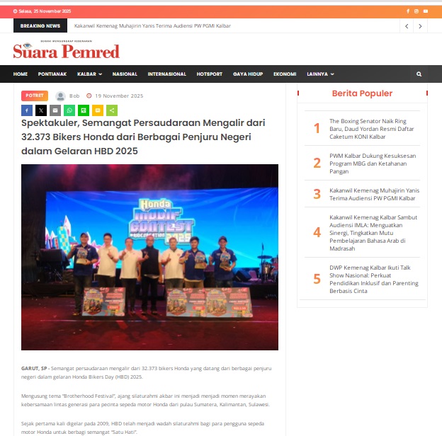 Spektakuler, Semangat Persaudaraan Mengalir dari 32.373 Bikers Honda dari Berbagai Penjuru Negeri dalam Gelaran HBD 2025 by masmul 19 November 2025 in Silahkan kunjungi https://www.suarapemredkalbar.com/read/potret/19112025/spektakuler-semangat-persaudaraan-mengalir-dari-32373-bikers-honda-dari-berbagai-penjuru-negeri-dalam-gelaran-hbd-2025. You Might Like Regional Public Launching New ADV160 The SUV Pride Grand Launching New PCX 160 Truly Exceptional! Tetap hati-hati ya bro sist berkendara saat hujan.