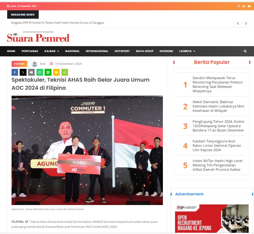 Spektakuler, Teknisi AHAS Raih Gelar Juara Umum AOC 2024 di Filipina by masmul 14 Desember 2024 in Silahkan kunjungi https://www.suarapemredkalbar.com/read/potret/14122024/spektakuler-teknisi-ahas-raih-gelar-juara-umum-aoc-2024-di-filipina. You Might Like Regional Public Launching New ADV160 The SUV Pride Grand Launching New PCX 160 Truly Exceptional! Tetap hati-hati ya bro sist berkendara saat hujan.