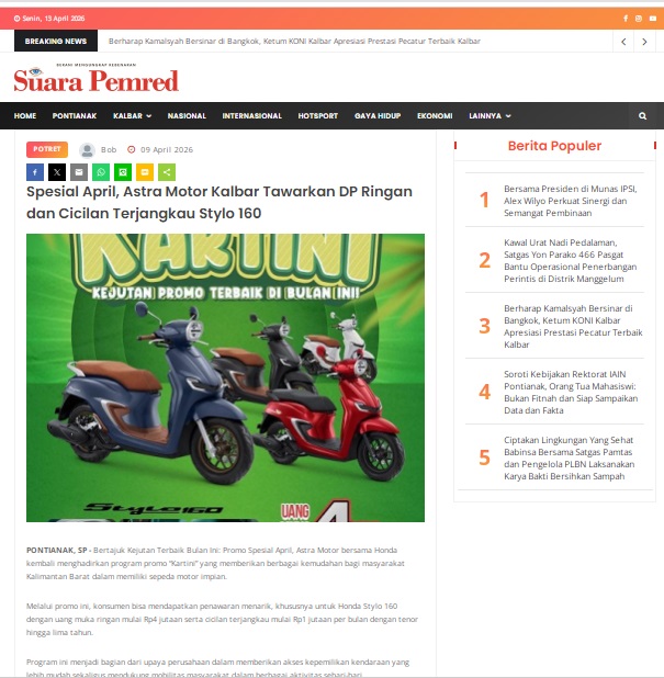Spesial April, Astra Motor Kalbar Tawarkan DP Ringan dan Cicilan Terjangkau Stylo 160 by masmul 9 April 2026 in Silahkan kunjungi https://www.suarapemredkalbar.com/read/potret/09042026/spesial-april-astra-motor-kalbar-tawarkan-dp-ringan-dan-cicilan-terjangkau-stylo-160. You Might Like Regional Public Launching New ADV160 The SUV Pride Grand Launching New PCX 160 Truly Exceptional! Tetap hati-hati ya bro sist berkendara saat hujan.