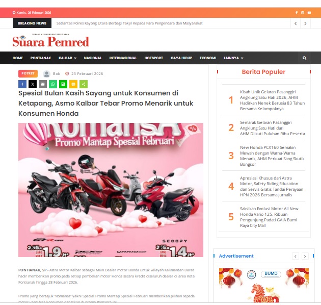 Spesial Bulan Kasih Sayang untuk Konsumen di Ketapang, Asmo Kalbar Tebar Promo Menarik untuk Konsumen Honda by masmul 23 Februari 2026 in Silahkan kunjungi https://www.suarapemredkalbar.com/read/potret/23022026/spesial-bulan-kasih-sayang-untuk-konsumen-di-ketapang-asmo-kalbar-tebar-promo-menarik-untuk-konsumen-honda. You Might Like Regional Public Launching New ADV160 The SUV Pride Grand Launching New PCX 160 Truly Exceptional! Tetap hati-hati ya bro sist berkendara saat hujan.