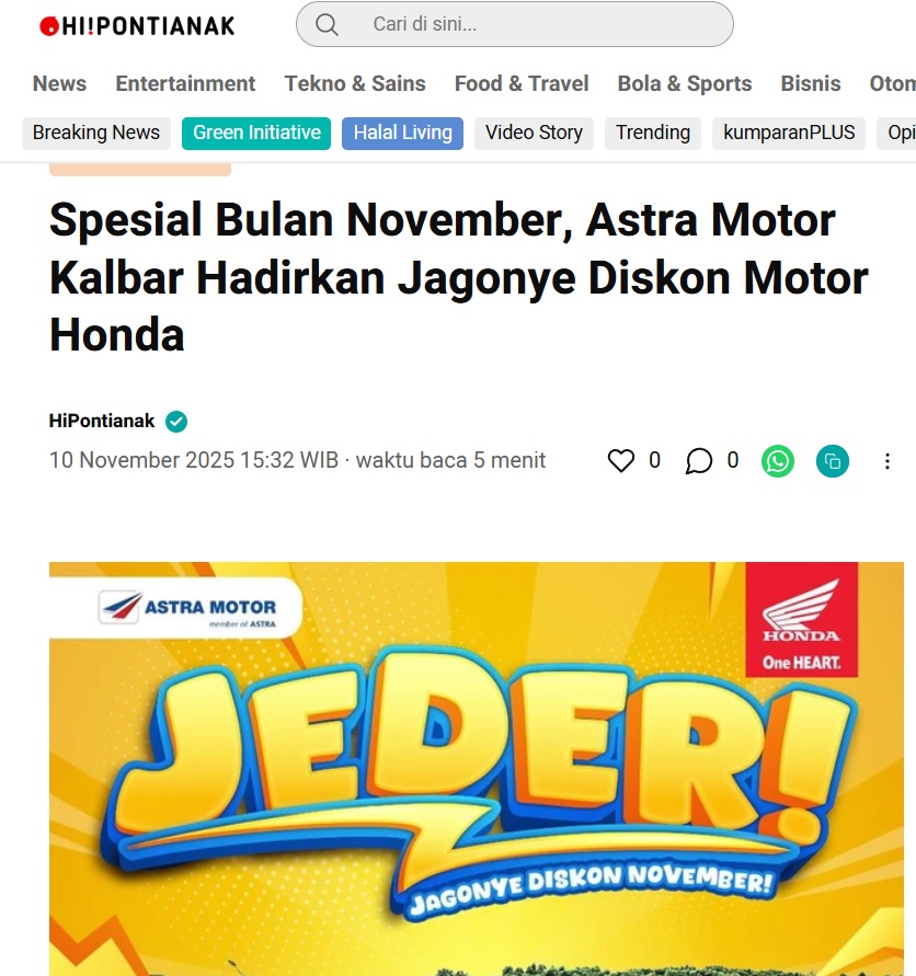 Spesial Bulan November, Astra Motor Kalbar Hadirkan Jagonye Diskon Motor Honda by Leo Prima 10 November 2025 in Silahkan kunjungi https://kumparan.com/hipontianak/26DAOqHmrMt?utm_source=App&utm_medium=wa&shareID=qUSPowPvYPZr. You Might Like Regional Public Launching New ADV160 The SUV Pride Grand Launching New PCX 160 Truly Exceptional! Tetap hati-hati ya bro sist berkendara saat hujan.