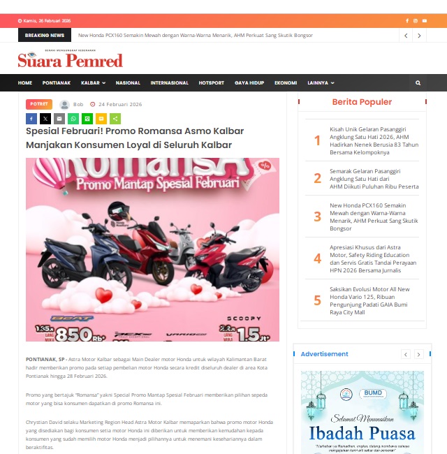 Spesial Februari! Promo Romansa Asmo Kalbar Manjakan Konsumen Loyal di Seluruh Kalbar by masmul 24 Februari 2026 in Silahkan kunjungi https://www.suarapemredkalbar.com/read/potret/24022026/spesial-februari-promo-romansa-asmo-kalbar-manjakan-konsumen-loyal-di-seluruh-kalbar. You Might Like Regional Public Launching New ADV160 The SUV Pride Grand Launching New PCX 160 Truly Exceptional! Tetap hati-hati ya bro sist berkendara saat hujan.