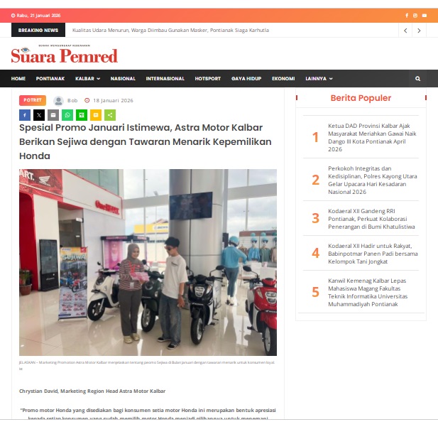 Spesial Promo Januari Istimewa, Astra Motor Kalbar Berikan Sejiwa dengan Tawaran Menarik Kepemilikan Honda by masmul 18 Januari 2026 in Silahkan kunjungi https://www.suarapemredkalbar.com/read/potret/18012026/spesial-promo-januari-istimewa-astra-motor-kalbar-berikan-sejiwa-dengan-tawaran-menarik-kepemilikan-honda. You Might Like Regional Public Launching New ADV160 The SUV Pride Grand Launching New PCX 160 Truly Exceptional! Tetap hati-hati ya bro sist berkendara saat hujan.