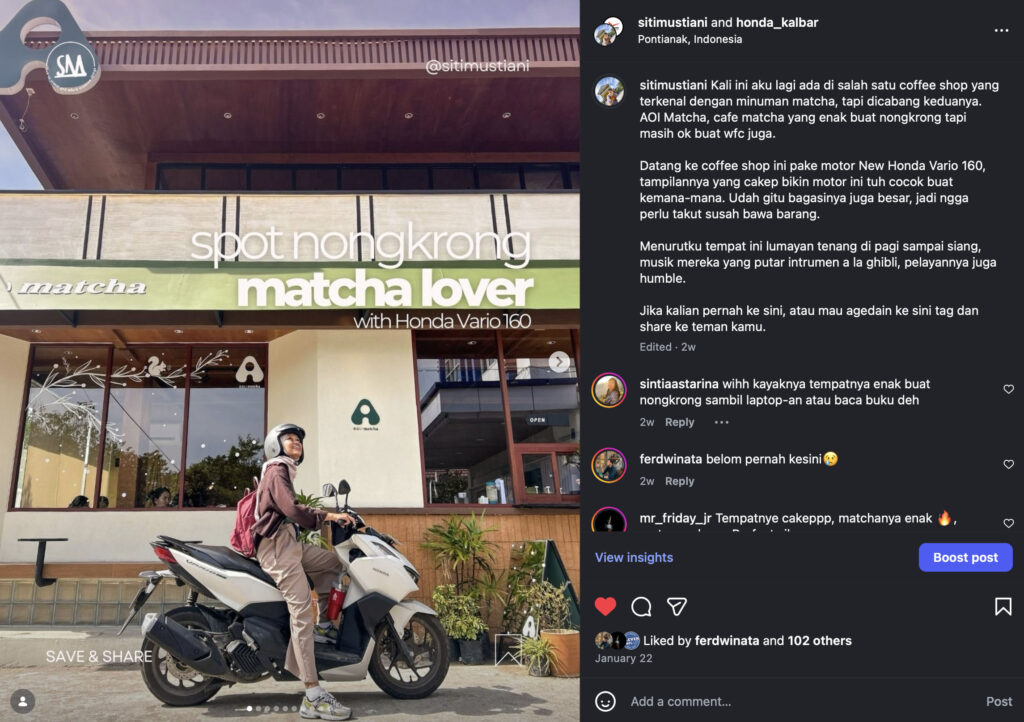 Spot Nongkrong Matcha Lover with Honda Vario 160 by Siti Mustiani 1 Februari 2026 in Silahkan kunjungi https://www.instagram.com/p/DTzG2oFEaTj/. Tags: AOI Matcha Astra Motor Kalimantan Barat Coffee Shop Honda Kalbar Honda Vario 160 Matcha Lover Spot Nongkrong vario Vario 160 Siti Mustiani http://www.sitimustiani.com Love to travel and adore creative things ✨ You Might Like Regional Public Launching New ADV160 The SUV Pride Grand Launching New PCX 160 Truly Exceptional! Tetap hati-hati ya bro sist berkendara saat hujan.