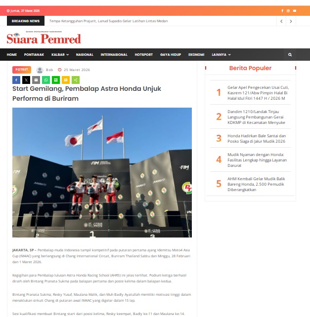 Start Gemilang, Pembalap Astra Honda Unjuk Performa di Buriram by masmul 25 Maret 2026 in Silahkan kunjungi https://www.suarapemredkalbar.com/read/potret/25032026/start-gemilang-pembalap-astra-honda-unjuk-performa-di-buriram. You Might Like Regional Public Launching New ADV160 The SUV Pride Grand Launching New PCX 160 Truly Exceptional! Tetap hati-hati ya bro sist berkendara saat hujan.