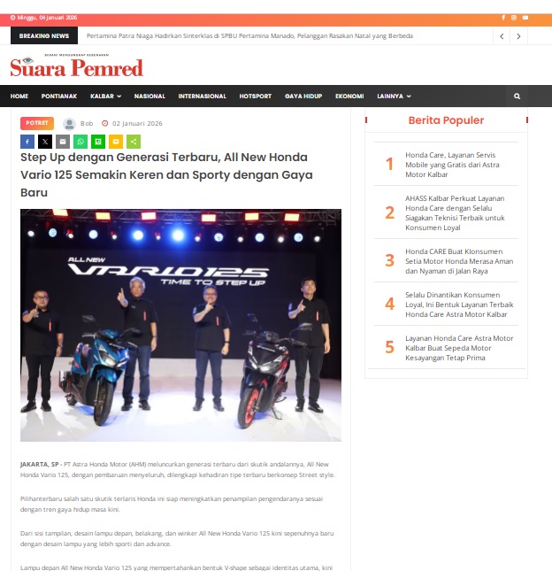 Step Up dengan Generasi Terbaru, All New Honda Vario 125 Semakin Keren dan Sporty dengan Gaya Baru by masmul 2 Januari 2026 in Silahkan kunjungi https://www.suarapemredkalbar.com/read/potret/02012026/step-up-dengan-generasi-terbaru-all-new-honda-vario-125-semakin-keren-dan-sporty-dengan-gaya-baru. You Might Like Regional Public Launching New ADV160 The SUV Pride Grand Launching New PCX 160 Truly Exceptional! Tetap hati-hati ya bro sist berkendara saat hujan.