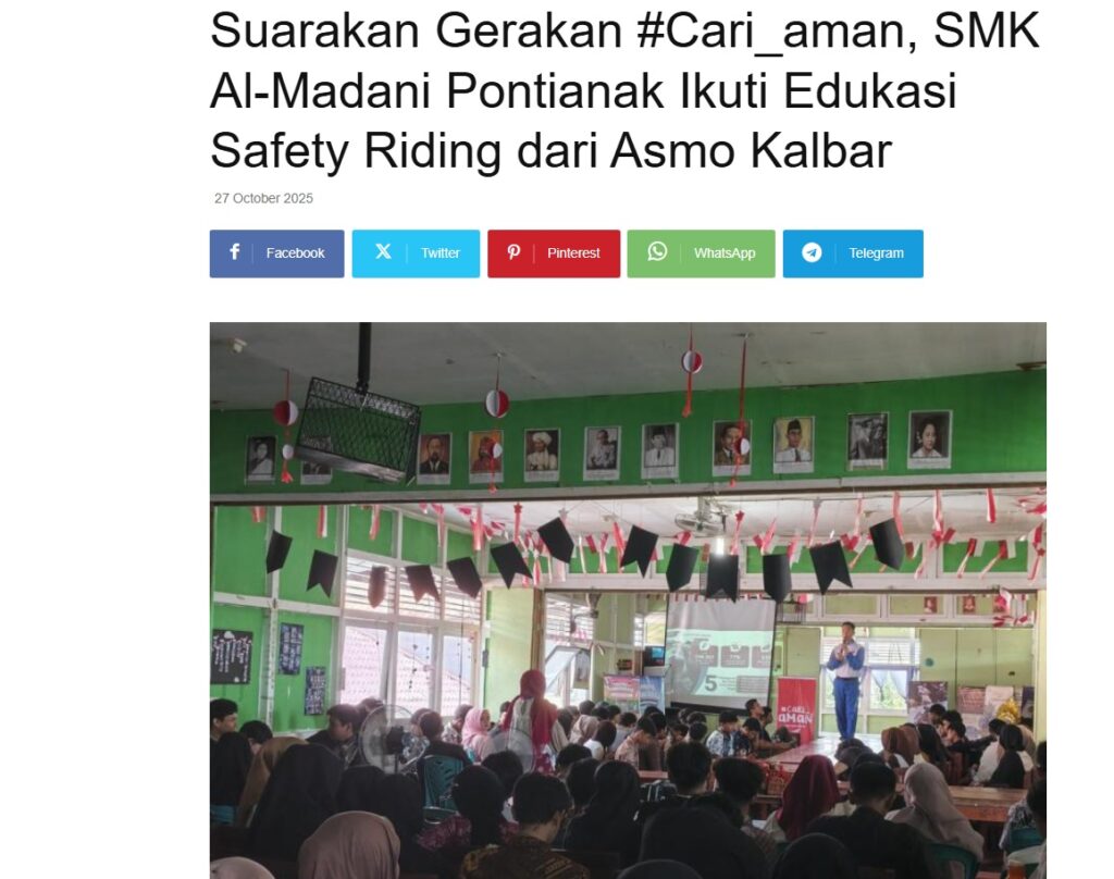 Suarakan Gerakan #Cari_aman, SMK Al-Madani Pontianak Ikuti Edukasi Safety Riding dari Asmo Kalbar by Nova Sari 27 Oktober 2025 in Silahkan kunjungi https://equator.co.id/suarakan-gerakan-cari_aman-smk-al-madani-pontianak-ikuti-edukasi-safety-riding-dari-asmo-kalbar/. You Might Like Regional Public Launching New ADV160 The SUV Pride Grand Launching New PCX 160 Truly Exceptional! Tetap hati-hati ya bro sist berkendara saat hujan.