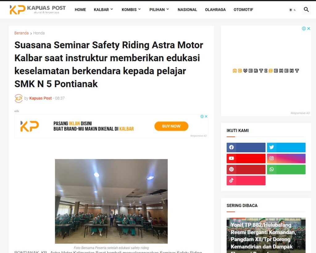 Suasana Seminar Safety Riding Astra Motor Kalbar saat instruktur memberikan edukasi keselamatan berkendara kepada pelajar SMK N 5 Pontianak by Muhammad Arif 26 Januari 2026 in Silahkan kunjungi https://www.kapuaspost.web.id/2026/01/suasana-seminar-safety-riding-astra.html. Tags: astra Astra Motor kalbar Astra Motor Pontianak astramotor honda kalbar pontianak sepeda motor You Might Like Regional Public Launching New ADV160 The SUV Pride Grand Launching New PCX 160 Truly Exceptional! Tetap hati-hati ya bro sist berkendara saat hujan.