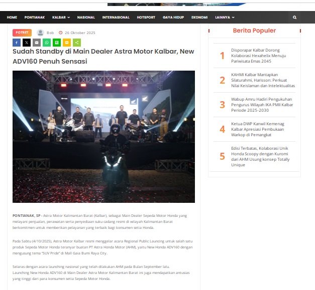 Sudah Standby di Main Dealer Astra Motor Kalbar, New ADV160 Penuh Sensasi by masmul 26 Oktober 2025 in Silahkan kunjungi https://www.suarapemredkalbar.com/read/potret/26102025/sudah-standby-di-main-dealer-astra-motor-kalbar-new-adv160-penuh-sensasi. You Might Like Regional Public Launching New ADV160 The SUV Pride Grand Launching New PCX 160 Truly Exceptional! Tetap hati-hati ya bro sist berkendara saat hujan.