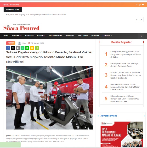 Sukses Digelar dengan Ribuan Peserta, Festival Vokasi Satu Hati 2025 Siapkan Talenta Muda Masuki Era Elektrifikasi by masmul 18 Maret 2025 in Silahkan kunjungi https://www.suarapemredkalbar.com/read/potret/18032025/sukses-digelar-dengan-ribuan-peserta-festival-vokasi-satu-hati-2025-siapkan-talenta-muda-masuki-era-elektrifikasi. You Might Like Regional Public Launching New ADV160 The SUV Pride Grand Launching New PCX 160 Truly Exceptional! Tetap hati-hati ya bro sist berkendara saat hujan.