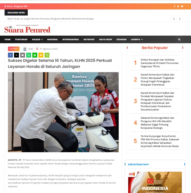 Sukses Digelar Selama 16 Tahun, KLHN 2025 Perkuat Layanan Honda di Seluruh Jaringan by masmul 27 Agustus 2025 in Silahkan kunjungi https://www.suarapemredkalbar.com/read/potret/27082025/sukses-digelar-selama-16-tahun-klhn-2025-perkuat-layanan-honda-di-seluruh-jaringan. You Might Like Regional Public Launching New ADV160 The SUV Pride Grand Launching New PCX 160 Truly Exceptional! Tetap hati-hati ya bro sist berkendara saat hujan.